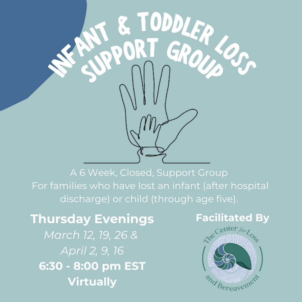 A 6-Week, Closed, Virtual Support Group for families who have lost an infant (after hospital discharge) or toddler (through age five). This group is funded through our Keegan Cares Initiative and facilitated by the Center for Loss and Bereavement